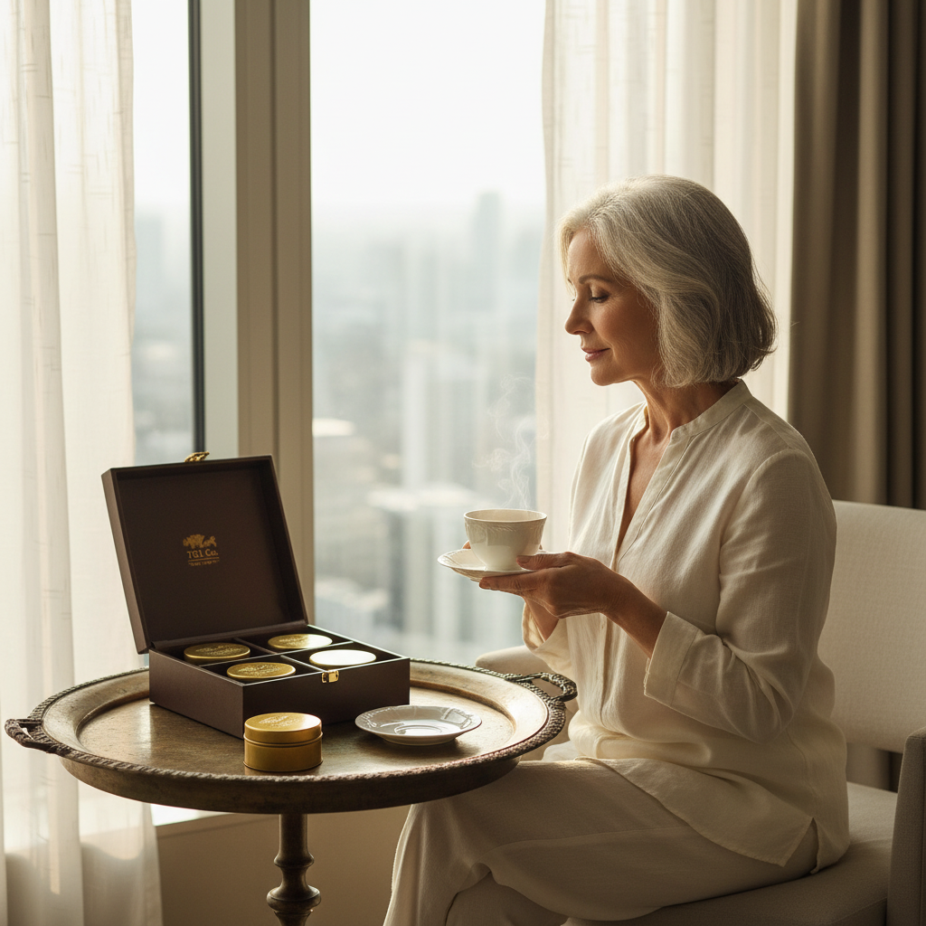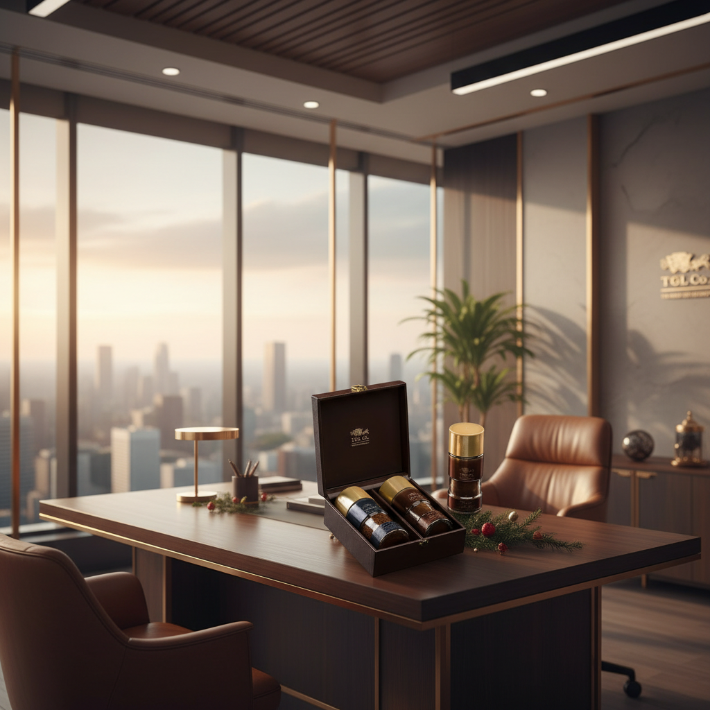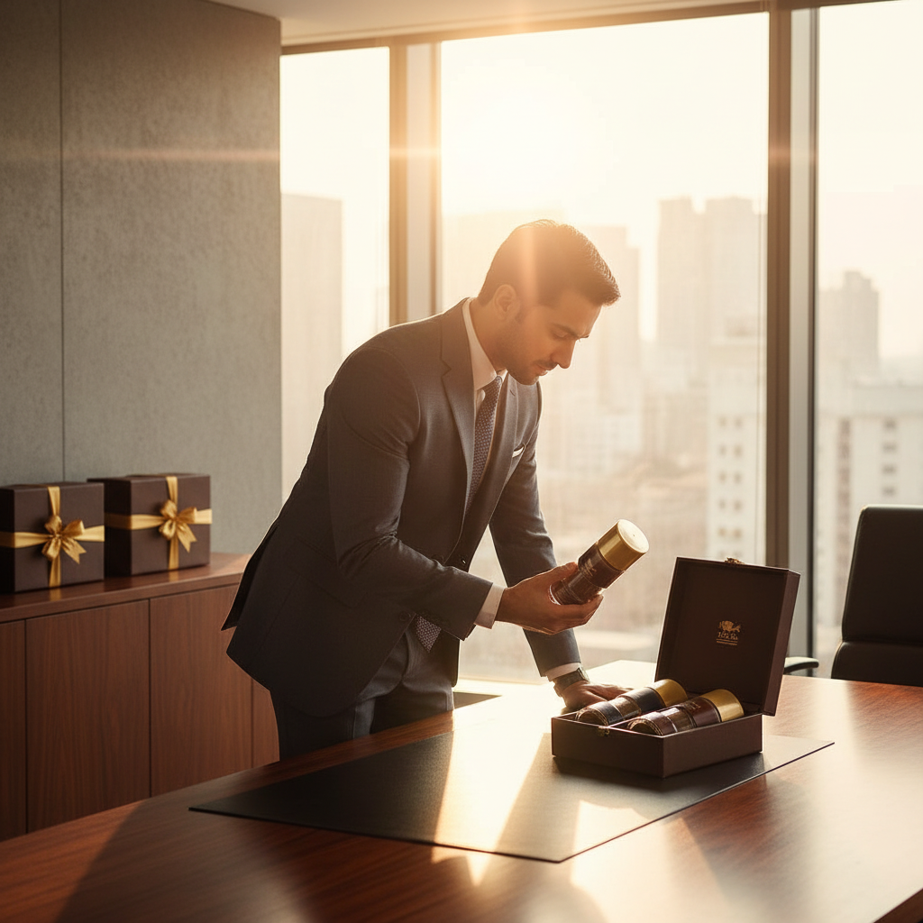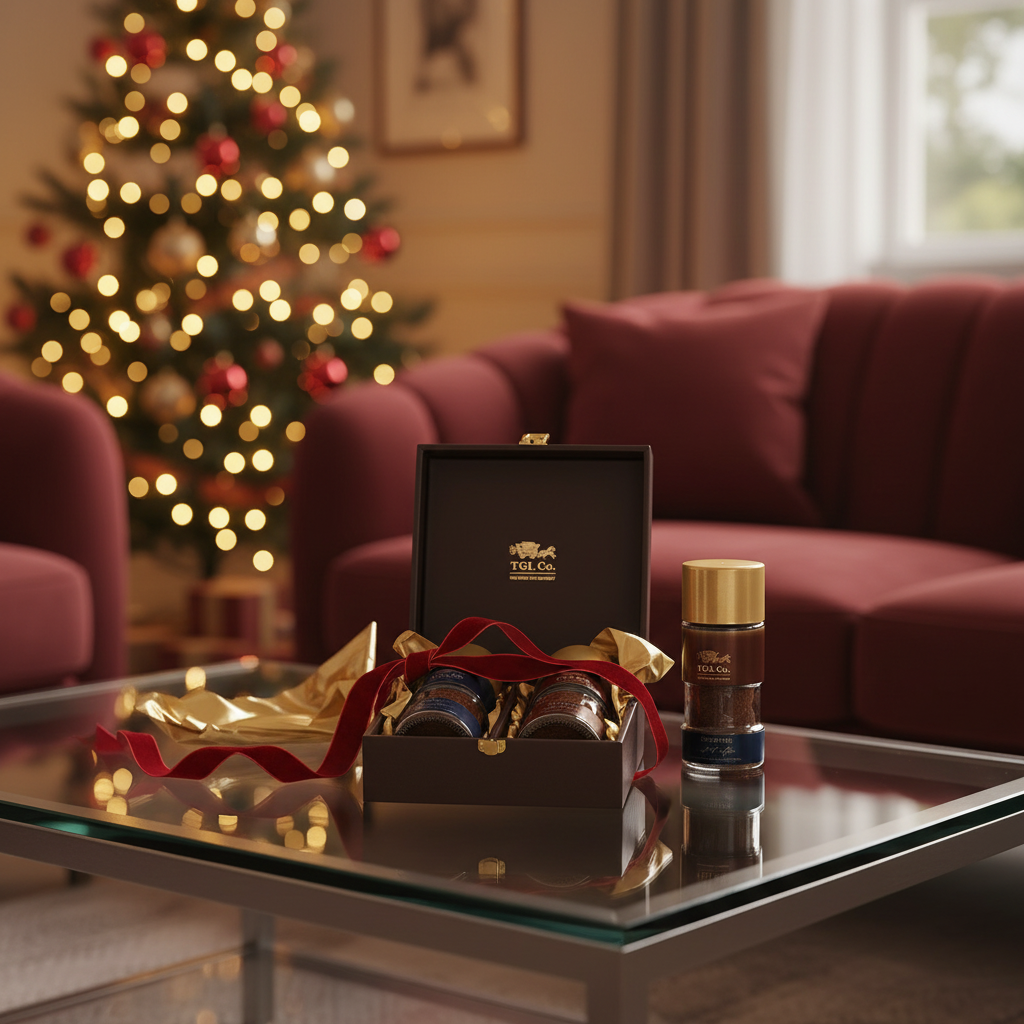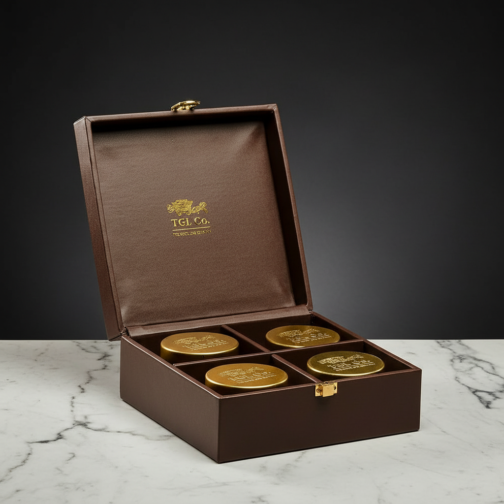 The elegant brown box encloses multiple options of gourmet coffee bottles, Teas & accessories and is enhanced with golden accents, posing as a timeless gift for loved ones.